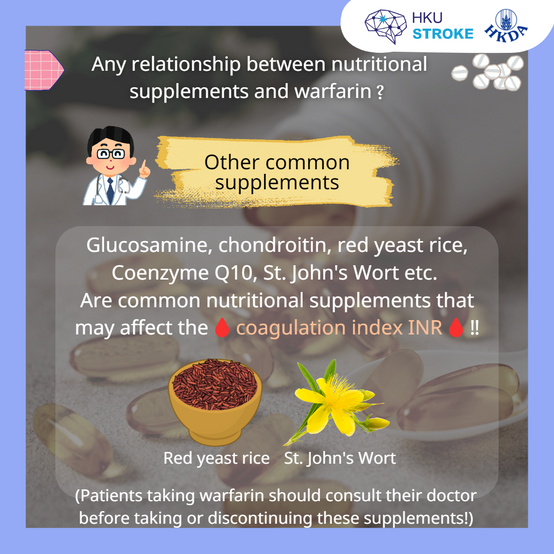 Common supplements such as glucosamine, chondroitin, red yeast rice, coenzyme Q10, St. John's wort, etc. have the potential to affect the coagulation index INR, thereby affecting the efficacy of warfarin.